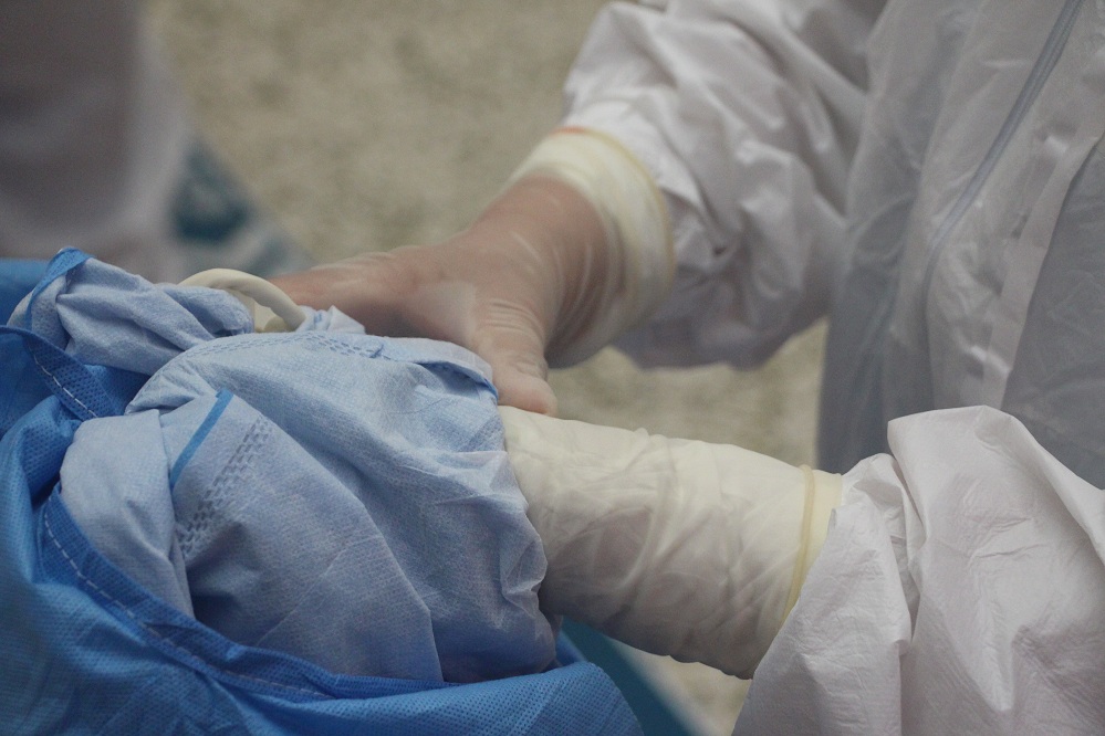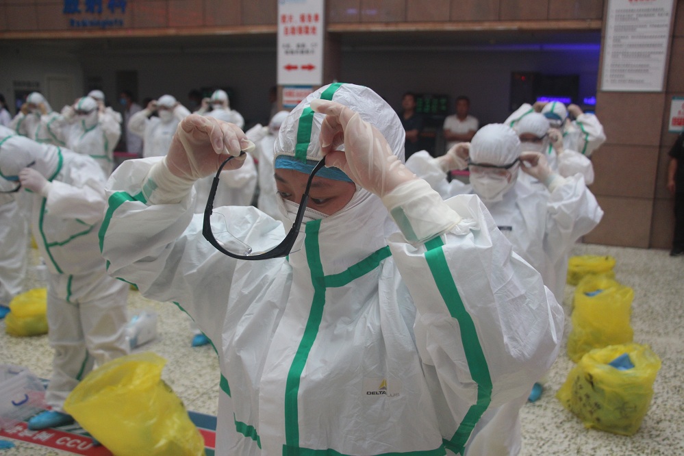 集體演練部分由心內(nèi)科二病區(qū)護(hù)士長劉焱(原隔離病區(qū)護(hù)士長)帶領(lǐng)來自預(yù)檢分診、發(fā)熱門診、院前急救、急診分診、隔離病房、臨床檢驗(yàn)6支重點(diǎn)部門的參賽隊(duì)伍進(jìn)行穿脫防護(hù)服和醫(yī)療廢物處理集體演練,以期通過此次演練大家都能正確掌握防護(hù)服的穿脫技能,在擔(dān)任醫(yī)療救治任務(wù)的同時(shí)也能保護(hù)好自己,做到院內(nèi)零感染。