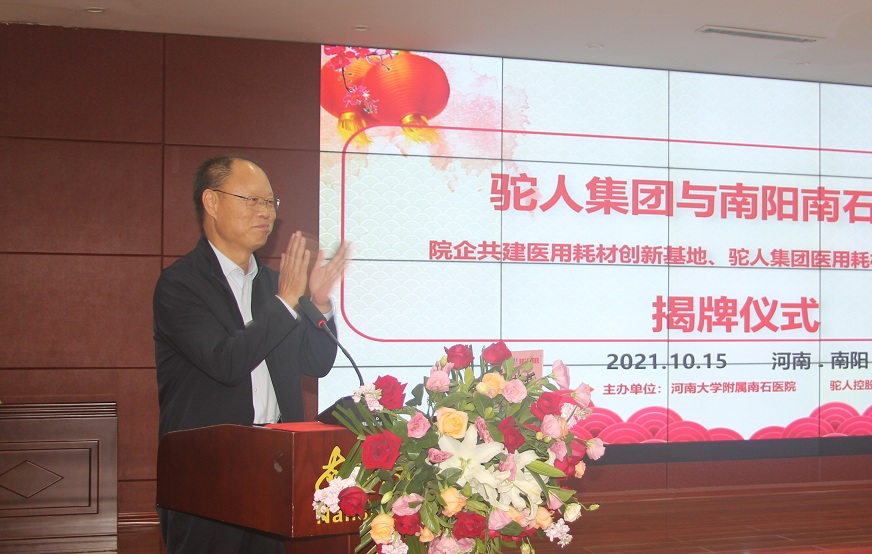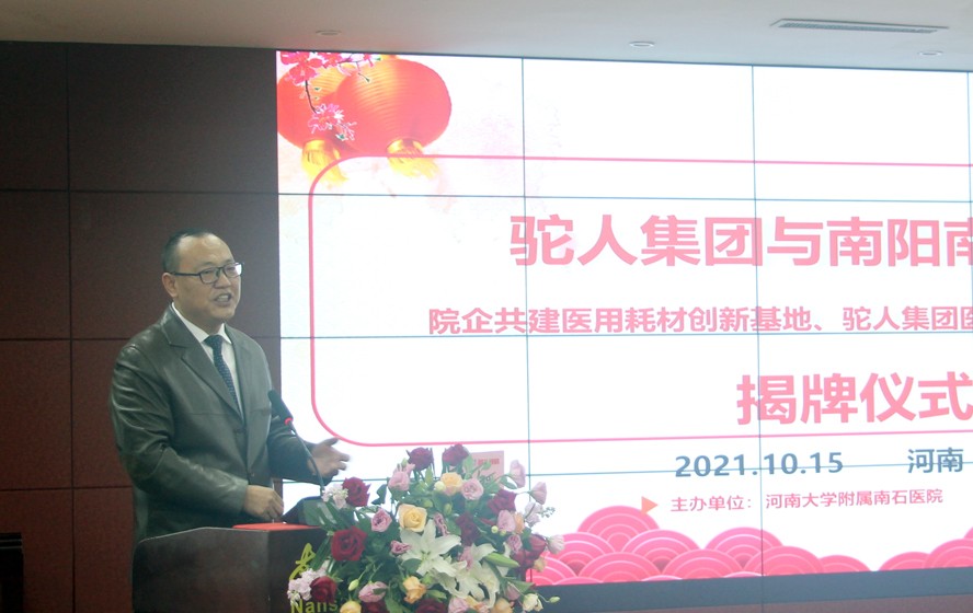 10月15日,駝人集團(tuán)與南石醫(yī)院共建醫(yī)用器材創(chuàng)新基地、駝人集團(tuán)醫(yī)用耗材科研實踐基地在南石醫(yī)院揭牌!南陽市市場監(jiān)督管理局高新區(qū)分局黨組書記局長陳馨菊,駝人集團(tuán)副總裁王瑞,南石醫(yī)院黨委書記院長趙俊祥,常務(wù)副院長石軍峰,執(zhí)行院長李獻(xiàn)哲,財務(wù)總監(jiān)陸月棧,祥瑞公司副總林云斌及南陽社會辦醫(yī)單位設(shè)備護(hù)理相關(guān)醫(yī)療工作者參加揭牌儀式。