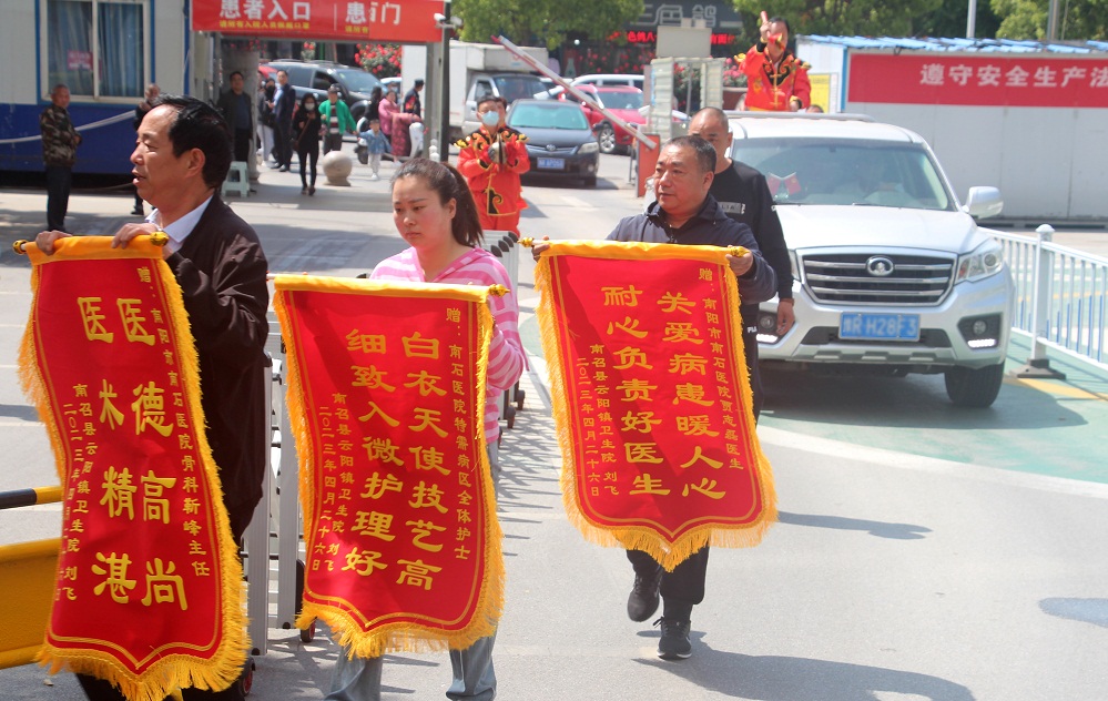 4月26日上午,一輛喧囂的鑼鼓車(chē)從南石醫(yī)院大門(mén)口到外科大樓一路“咚咚鏘、咚咚鏘……”引來(lái)眾人圍觀,伴著歡快的鑼鼓聲,患者與家屬把三面錦旗分別送到南石醫(yī)院骨病中心副主任梁衛(wèi)中、賈志磊大夫,特需病區(qū)潘曉蓓護(hù)士長(zhǎng)手中,還有一封充滿(mǎn)情感的感謝信,感謝骨病中心靳峰主任一次又一次的耐心勸導(dǎo),感謝特需病區(qū)的溫馨服務(wù)。