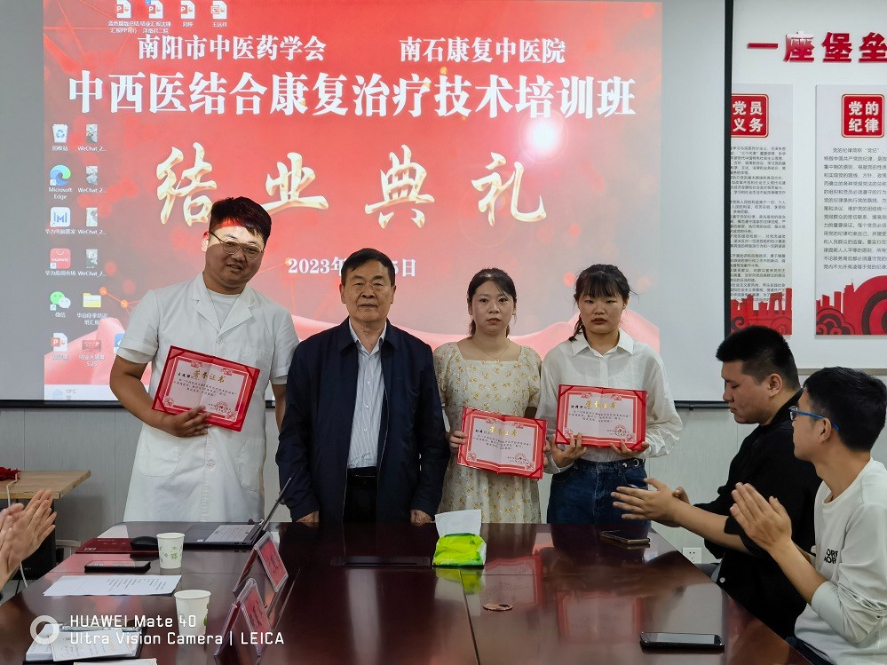 南石康復(fù)中醫(yī)院副院長劉明偉主持結(jié)業(yè)典禮,南陽市中醫(yī)藥學(xué)會張夏賓科長,南石醫(yī)院黨委委員、副院長石軍峰,南石康復(fù)中醫(yī)院院長王建暉在結(jié)業(yè)典禮上講話。康復(fù)中醫(yī)院部分教學(xué)老師及培訓(xùn)學(xué)員參加結(jié)業(yè)典禮。