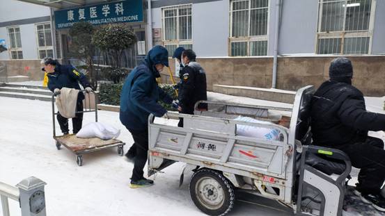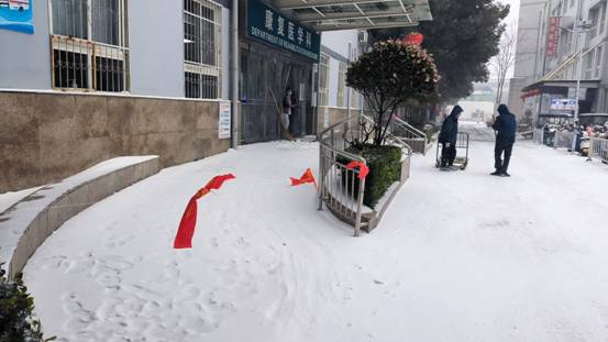 醫(yī)院內(nèi)各條主干道全部暢通無(wú)阻,消除了安全隱患,坡道鋪墊舊床單等,讓患者及家屬在此清理腳上積雪,確保不出現(xiàn)滑倒現(xiàn)象。